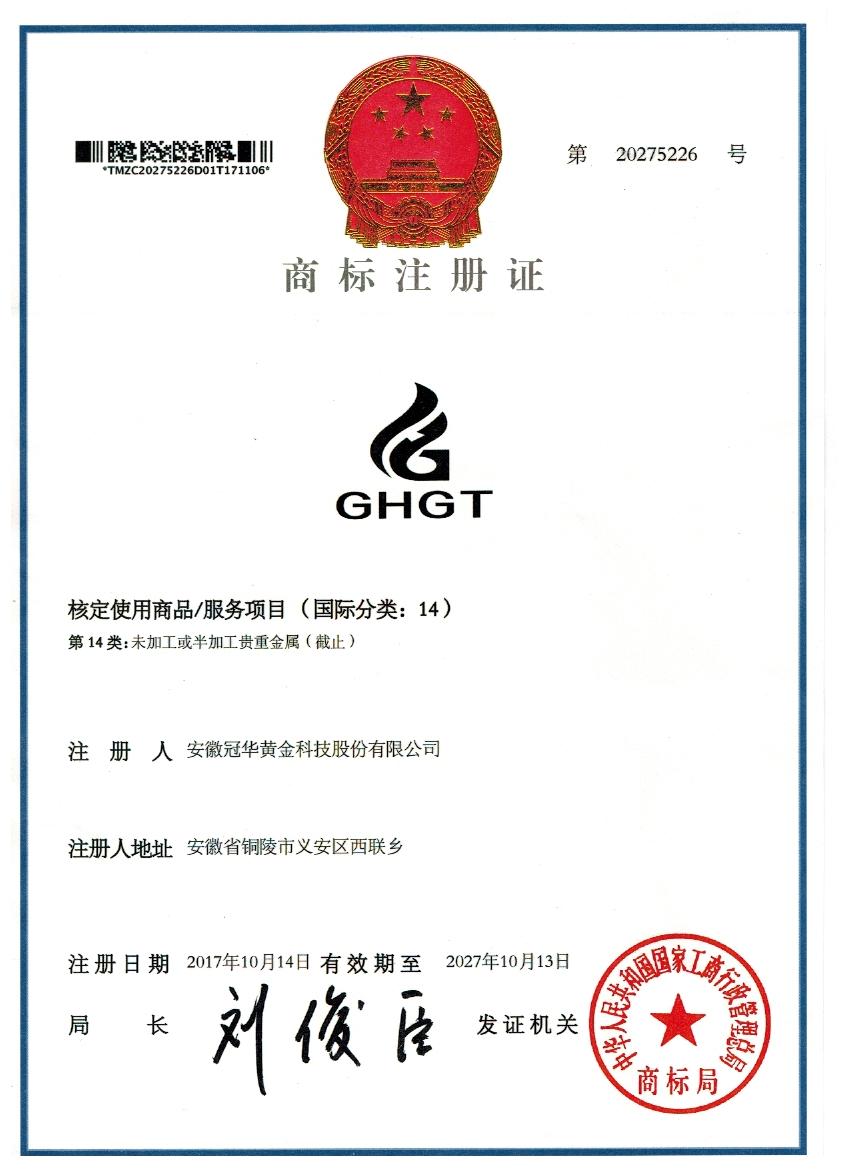 熱烈祝賀我公司申請(qǐng)注冊(cè)的“冠華黃金”商標(biāo),獲得中華人民共和國國家工商行政管理總局商標(biāo)局核準(zhǔn)注冊(cè)成功。